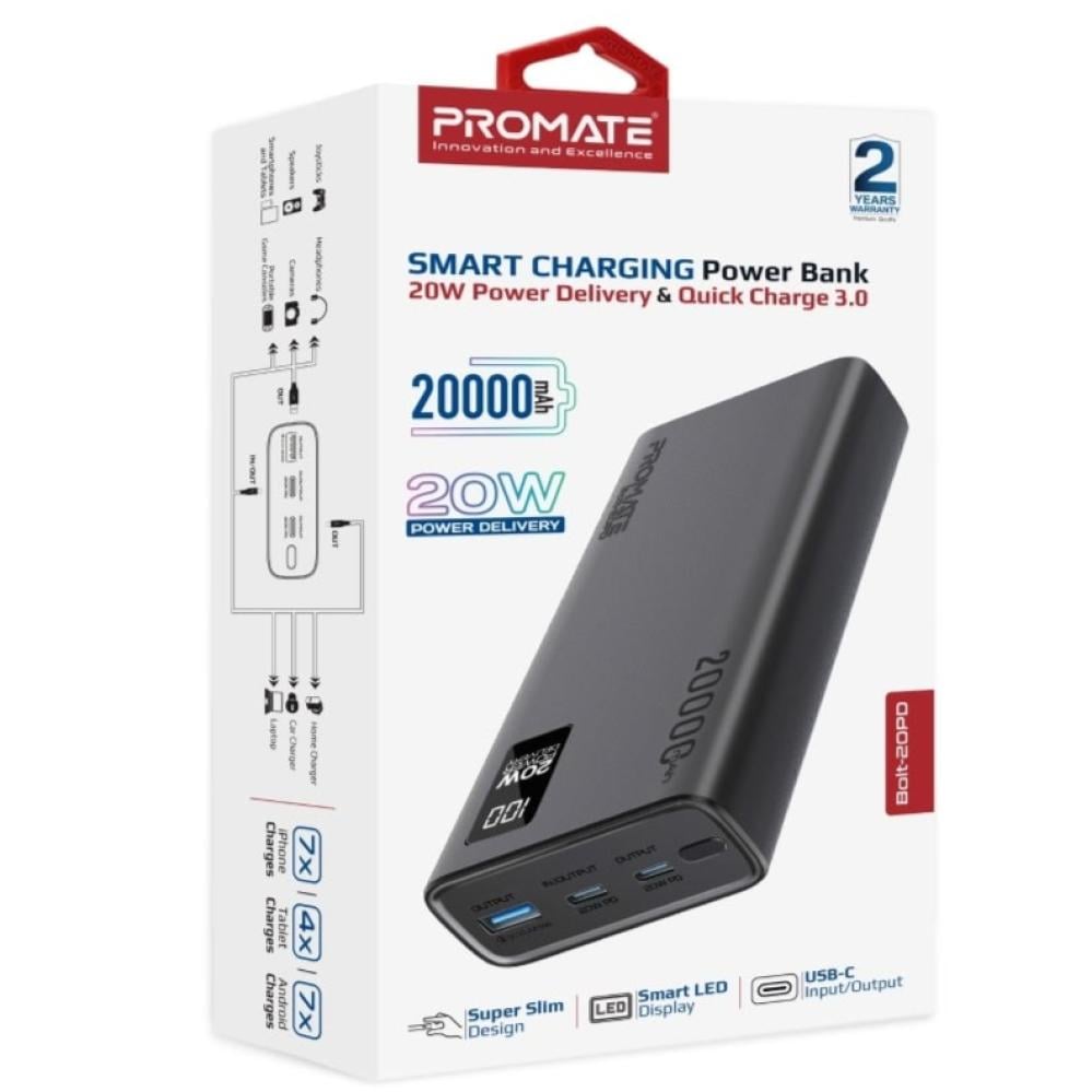 تتميز PROMATE Bolt-20PD بتقنية الشحن الذكي (Smart Charging) و توصيل الطاقة بقوة 20 واط (20W Power Delivery)، بالإضافة إلى دعمها لتقنية الشحن السريع Quick Charge 3.0، مما يضمن شحن أجهزتك بسرعة قياسية، سواء كانت هواتف ذكية، أجهزة لوحية، أو سماعات رأس. بفضل سعتها الكبيرة، يمكنك شحن هاتفك عدة مرات قبل الحاجة لإعادة شحن البطارية نفسها.