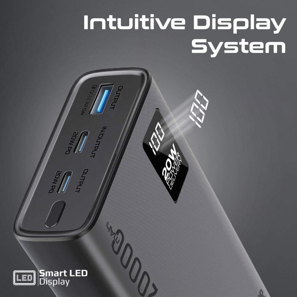يأتي هذا الباور بانك مزودًا بشاشة LED ذكية وواضحة (Smart LED Display) تعرض مستوى الشحن المتبقي بدقة، بالإضافة إلى حالة الشحن الحالية (مثل "PD" عند استخدام الشحن السريع)، مما يمنحك تحكمًا كاملاً وراحة بال. يوفر تصميمه النحيف للغاية (Super Slim Design) سهولة الحمل في الجيب أو الحقيبة دون إضافة عبء.